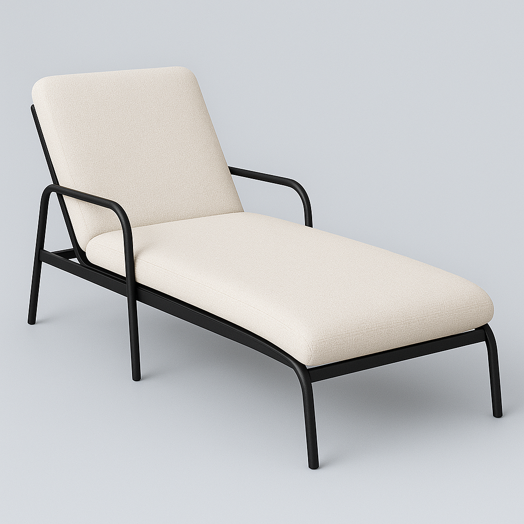 شيزلونج خارجي بهيكل معدني أسود مط، وتنجيد قماش أوف وايت.